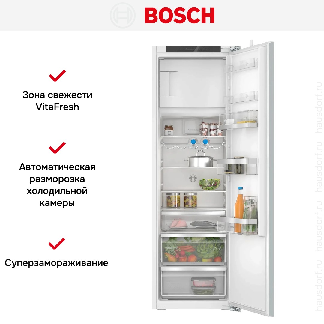 Встраиваемый холодильник Bosch KIL82ADD0 сочетает современный дизайн и продуманную эргономику для установки в мебель. Высота 177.2 см и ширина 55.8 см позволяют интегрировать прибор в стандартную кухонную нишу глубиной 55-56 см. Передняя панель рассчитана под навес вашeго фасада, а встроенная вертикальная ручка действует как незаметный элемент управления. Скользящее крепление двери и техника плоских шарниров обеспечивают плотную прилегающую поверхность.