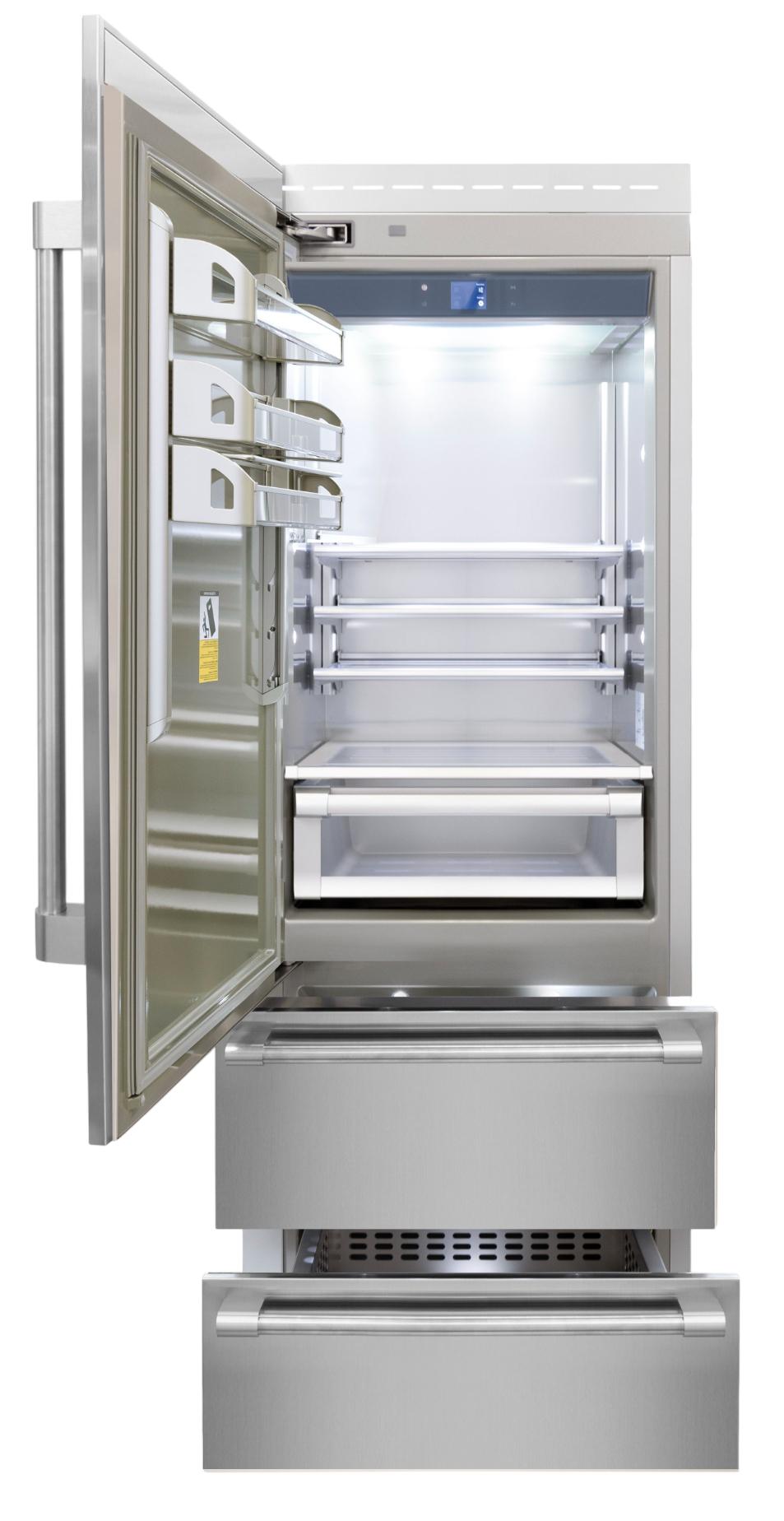 Трехкамерные модели выпускаются в нескольких вариантах. В некоторых случаях в качестве третьей камеры поступает так называемая зона свежести — отделение, где поддерживается температура около 0 градусов. В другом варианте подобные модели имеют морозильную камеру, состоящую из двух выдвижных ящиков.