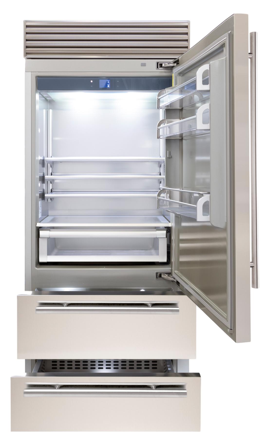 Трехкамерные модели выпускаются в нескольких вариантах. В некоторых случаях в качестве третьей камеры поступает так называемая зона свежести — отделение, где поддерживается температура около 0 градусов. В другом варианте подобные модели имеют морозильную камеру, состоящую из двух выдвижных ящиков.