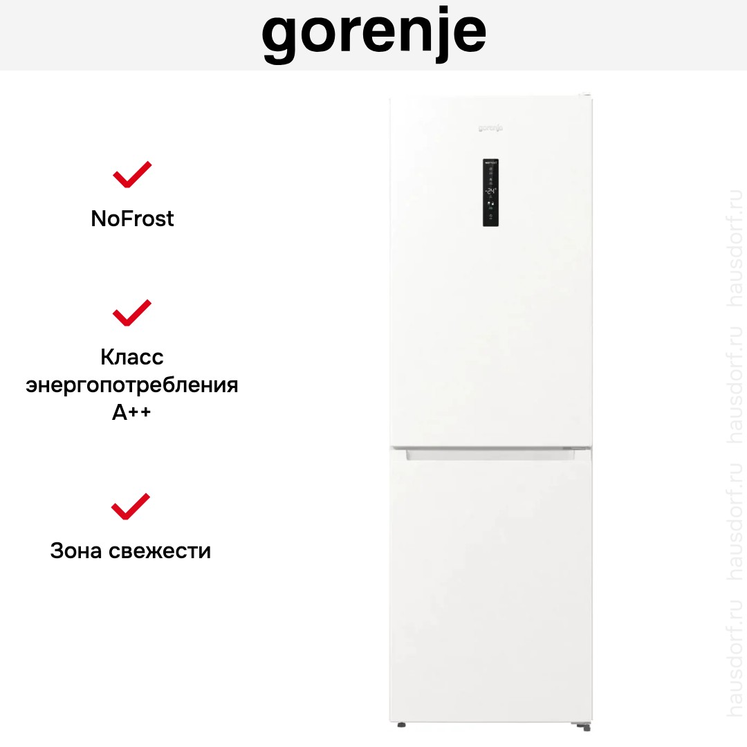 Холодильник Gorenje NRKP61EA2W4 выглядит сдержанно и цельно: корпус белого цвета с металлическим фасадом, ровные плоскости, скрытая ручка без выступов, на дверце — компактный цифровой дисплей с сенсорными кнопками. Две двери с правым упором, при необходимости можно перевесить. Габариты 185×59.5×59.2 см позволяют установить прибор отдельно или в стандартную кухонную нишу по концепции KitchenFit.