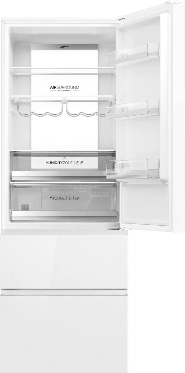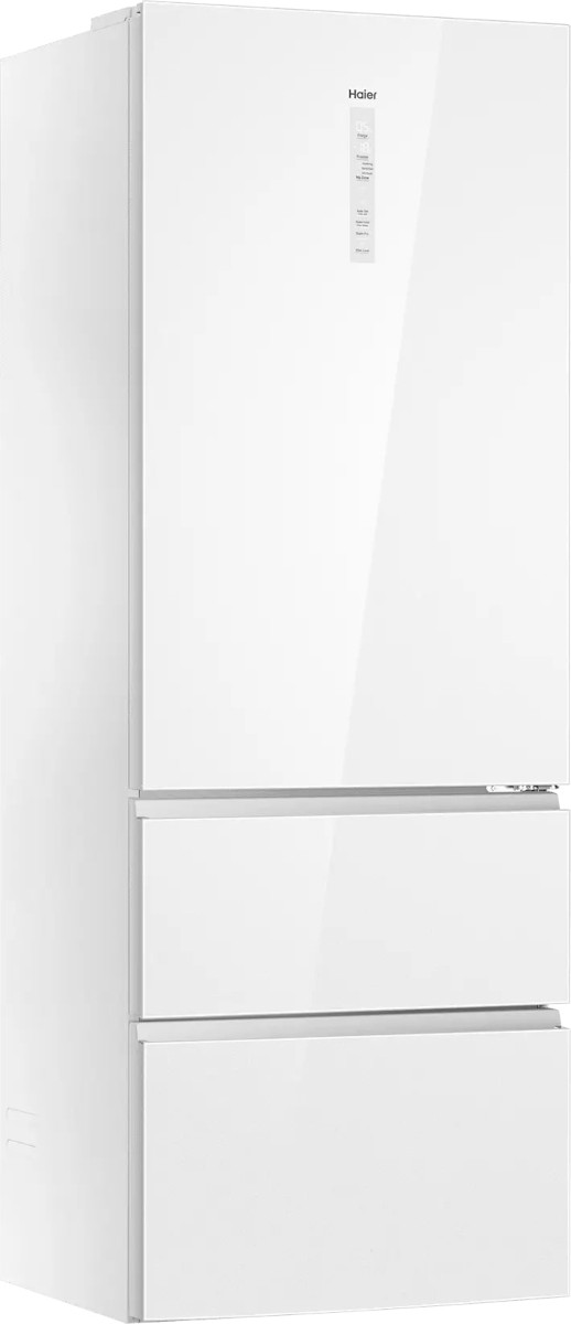 Холодильник Haier A4F745CGWGRU1 представляет собой высокую и вместительную модель с современным стеклянным фасадом и скрытой ручкой, что делает прибор аккуратным и минималистичным на любой кухне. Его габариты 200,6×70×67,5 см обеспечивают высокий объем при компактной ширине, а белый цвет корпуса легко вписывается в разные интерьеры. Три двери и нижняя морозильная камера оптимизируют эргономику: верхняя зона отведена под основной холодильник, а низ — для глубокого хранения и заморозки.