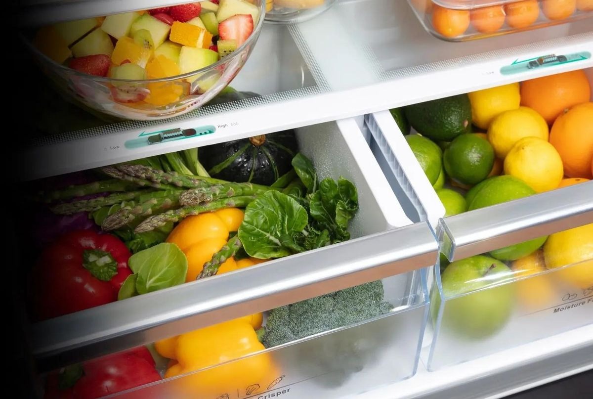 Вместительные контейнеры позволяют хранить достаточное количество овощей и фруктов. Для более длительного хранения и поддержания свежести овощей и фруктов разработаны специальные системы хранения. Среди них, например, зона свежести с увеличенной влажностью до 85% и температурой около 0 градусов. Это герметично закрывающийся ящик, часто на выдвижных роликах или направляющих, в котором имеется специальное задвижка, позволяющая регулировать влажность. Как известно, при более высокой влажности продукты с большим содержанием воды дольше остаются свежими.