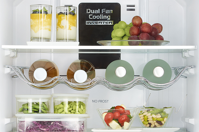 Специальная зона свежести предназначена для правильного и более длительного хранения овощей, фруктов, зелени. В ней поддерживается околонулевая температура, поэтому продукты не перемораживаются и не пересыхают. Система охлаждения этого холодильника — Dual Fan Cooling.