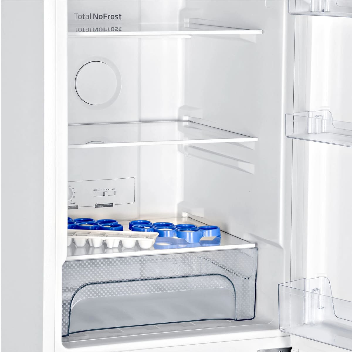 No Frost (Total No Frost, Frost Free): вентилятор обеспечивает циркуляцию охлажденного воздуха, благодаря чему лед не нарастает на стенке, а концентрируется только на скрытом внутри холодильника испарителе. Талая вода собирается в специальной емкости и испаряется. Такой холодильник не нужно размораживать – это экономит время и позволяет не останавливать прибор. Благодаря этим плюсам в современных моделях No Frost – самая распространенная система.