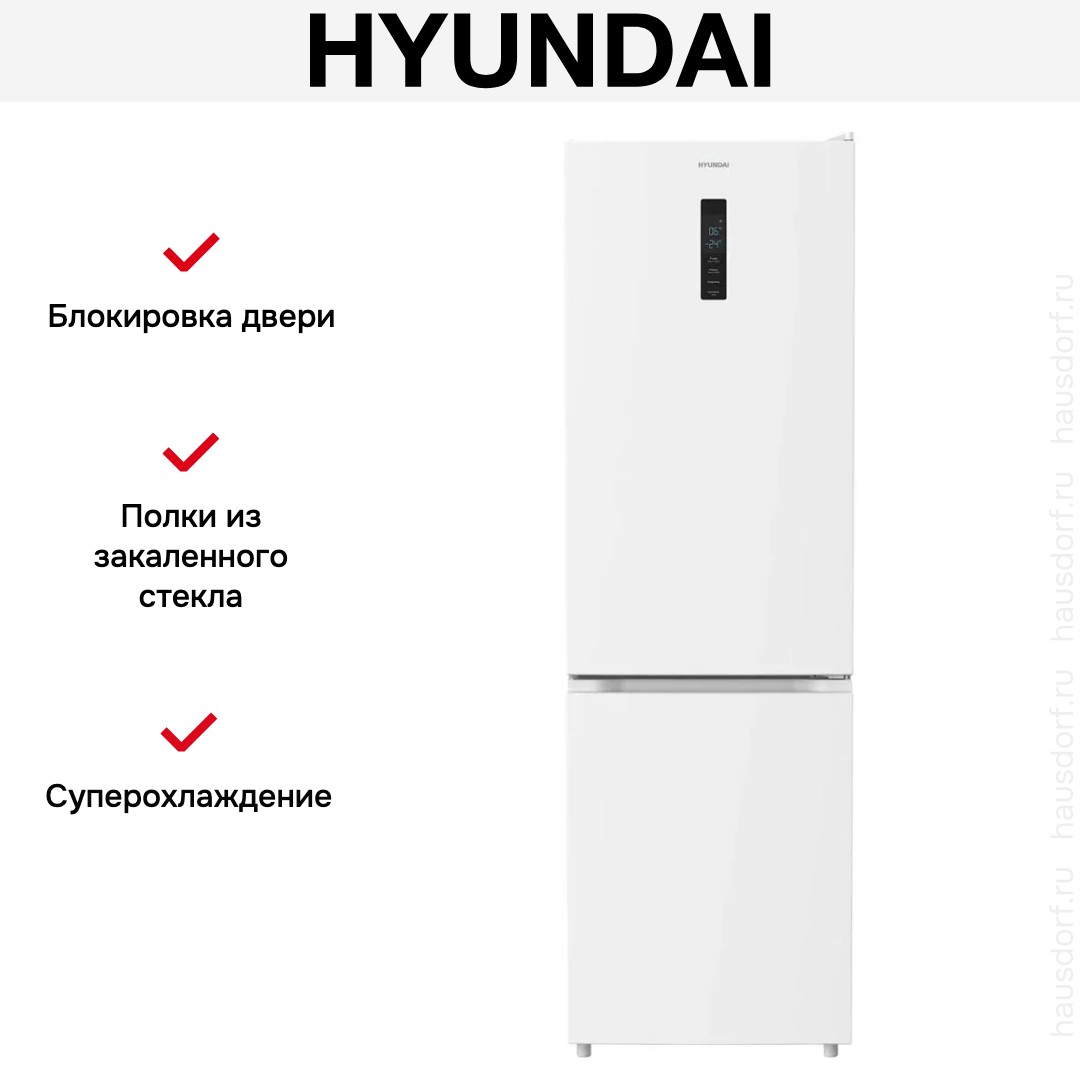 Холодильник Hyundai CC35083F — отдельно стоящий двухкамерный агрегат высотой 193.5 см с аккуратным белым фронтом и окрашенными боковинами.