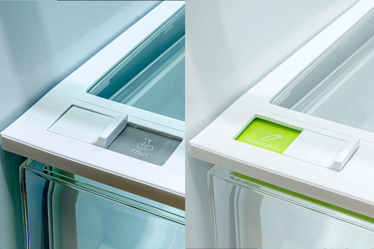 Ящики для продуктов изготавливаются либо целиком из прозрачного пластика, либо часто имеют переднюю прозрачную панель, которая обеспечивает лучший обзор. Полки в большинстве холодильников могут перемещаться по высоте, устанавливаются на специальных направляющих и без труда снимаются для очистки.