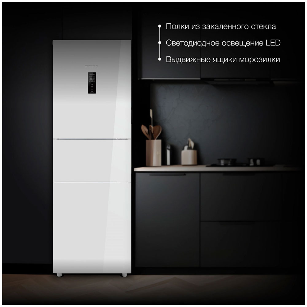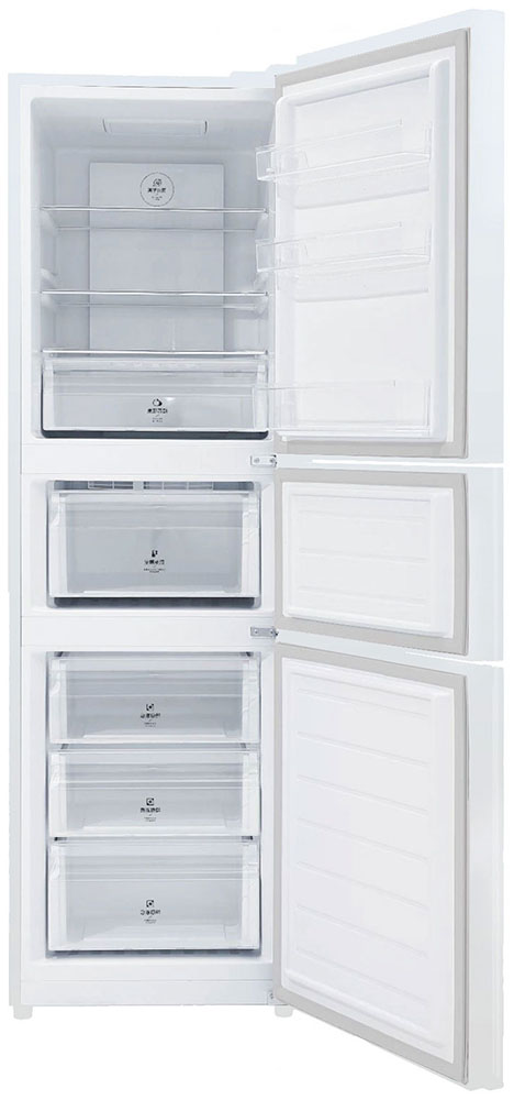 Трехкамерные модели выпускаются в нескольких вариантах. В некоторых случаях в качестве третьей камеры поступает так называемая зона свежести — отделение, где поддерживается температура около 0 градусов. В другом варианте подобные модели имеют морозильную камеру, состоящую из двух выдвижных ящиков.