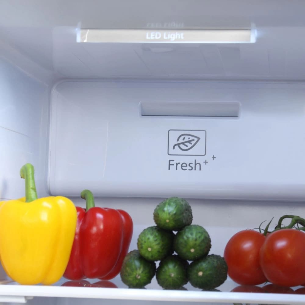 Вместительные контейнеры позволяют хранить достаточное количество овощей и фруктов. Для более длительного хранения и поддержания свежести овощей и фруктов разработаны специальные системы хранения. Среди них, например, зона свежести с увеличенной влажностью до 85% и температурой около 0 градусов. Это герметично закрывающийся ящик, часто на выдвижных роликах или направляющих, в котором имеется специальное задвижка, позволяющая регулировать влажность. Как известно, при более высокой влажности продукты с большим содержанием воды дольше остаются свежими.