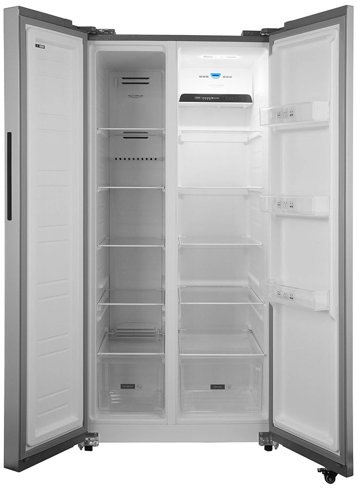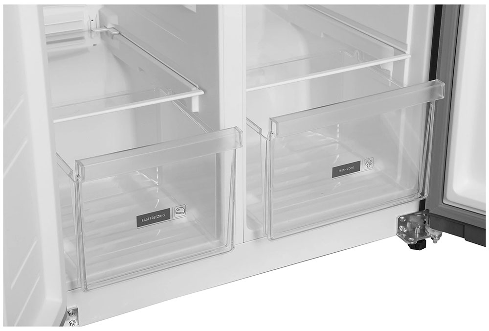 Данная модель — отдельностоящая, поэтому нужно тщательно подобрать место для ее размещения. Холодильник Side-by-Side с необычным расположением камер — сбоку друг от друга — позволяет увеличить объем продуктов для хранения. Такой вариант подходит обладателям просторной кухни, большим семьям, людям, которые запасают продукты и готовят впрок. Количество камер: 2.