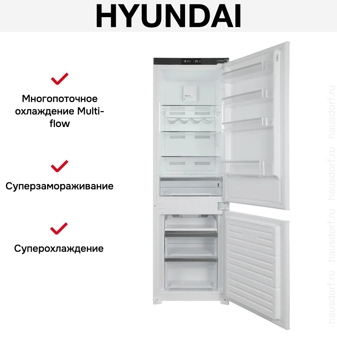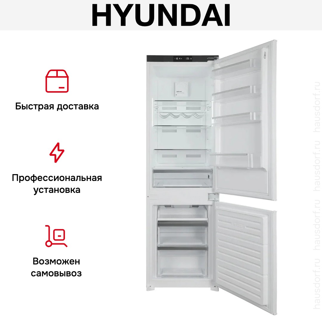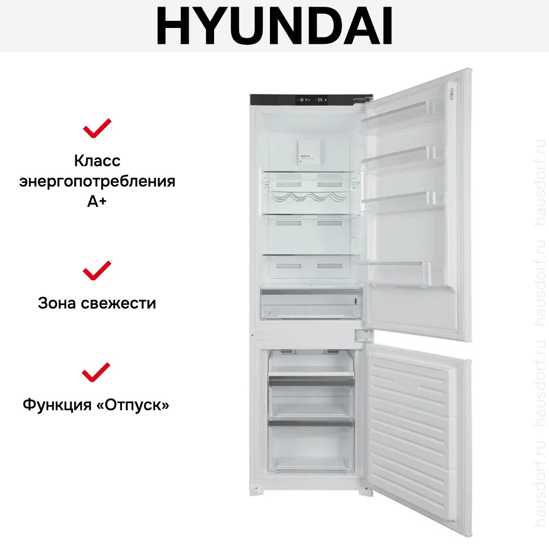 Встраиваемый холодильник Hyundai HBR-1786 создан для тех, кто ценит аккуратный интерьер и удобство использования в одной покупке. Его белый фронт и окрашенные боковые панели подстраиваются под фасад кухни, а металлический корпус обеспечивает надежность и долговечность конструкции. Жесткое крепление дверей по системе door on door делает монтаж плотным и ровным, благодаря чему прибор становится естественной частью гарнитура. Правый дверной упор учитывает распространенные схемы установки и помогает разместить технику в плотной кухонной композиции.