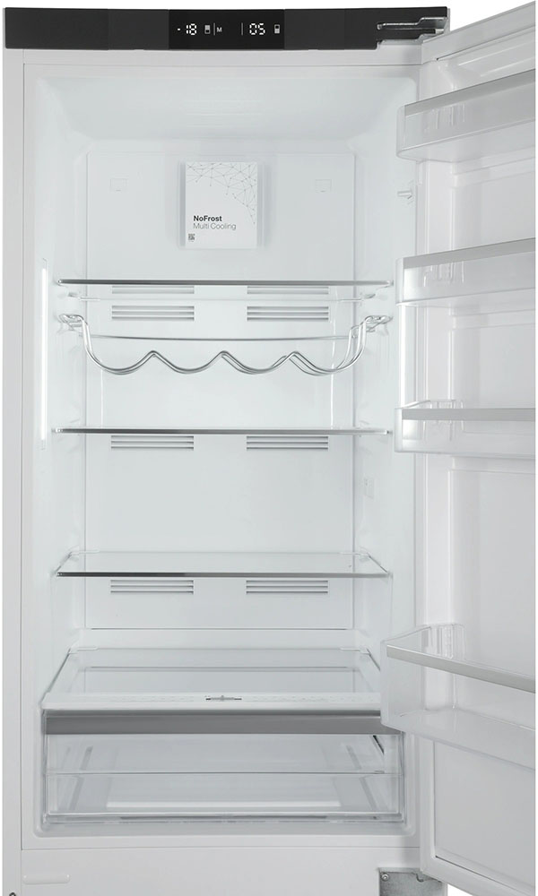 Встраиваемый прибор проще разместить в комнате, даже если общий метраж не такой уж большой. Вы можете спрятать его за декоративной панелью от мебельного фасада — советуем заранее определить нишу и заказывать панели исходя из типа крепления к двери. Холодильник с морозильником обладает всеми опциями, которые чаще всего ищут и выбирают покупатели. Стандартная конфигурация — универсальный вариант для любой квартиры. Количество камер: 2.