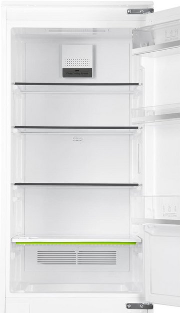 No Frost (Total No Frost, Frost Free): вентилятор обеспечивает циркуляцию охлажденного воздуха, благодаря чему лед не нарастает на стенке, а концентрируется только на скрытом внутри холодильника испарителе. Талая вода собирается в специальной емкости и испаряется. Такой холодильник не нужно размораживать – это экономит время и позволяет не останавливать прибор. Благодаря этим плюсам в современных моделях No Frost – самая распространенная система.