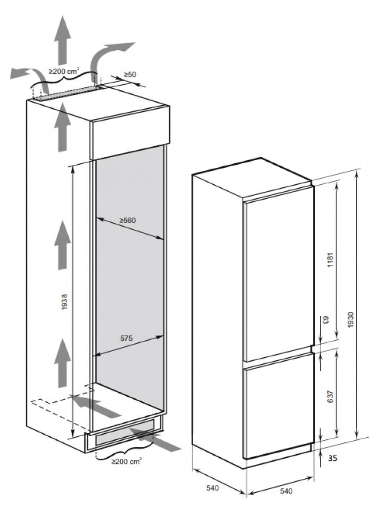 Встраиваемые холодильники монтируются в нишу или колонну. Передняя их часть закрывается декоративным мебельным фасадом и снаружи не отличается от дверцы обычного кухонного шкафа, так что их не нужно подбирать под интерьер помещения. Объем этих холодильников, как правило, несколько меньше, чем у отдельностоящих, так как при встраивании необходимо оставлять свободное пространство для вентиляции. Они отличаются меньшим уровнем шума, а также лучше держат холод и отличаются большей экономичностью из-за дополнительного слоя изоляции. Ассортимент этих холодильников не так велик, как у отдельно стоящих, установка более трудоемкая, а стоимость обычно несколько выше.