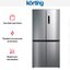 Четырехдверный холодильник Korting KNFM 81787 X — отдельно стоящая модель высотой 177 см и шириной 83 см в корпусе цвета нержавеющей стали. Модель принадлежит к климатическому классу SN-N-ST-T и может эксплуатироваться в помещениях с температурой воздуха от +10 до +43 градусов.Две морозильные камеры объемом 153 литра расположены в нижней части, а сверху находится большая холодильная камера с распашными дверцами. Общий объем холодильника составляет 450 литров. На фронтальной части находится электронная сенсорная панель управления, которая служит для регулировки температуры в камерах и активации дополнительных опций.