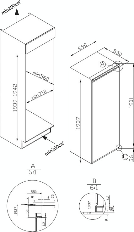 - Габариты ниши для встраивания (ВхШхГ): 193.9-194.2х71.2х56 см