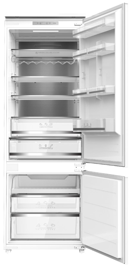 Холодильник Кортинг KSI 17780 CVNF общим объемом 243 литра в корпусе белого цвета оснащен электронной системой управления: панель с сенсорными кнопками и дисплеем находится в верхней части корпуса над дверцей. Система размораживания No Frost в обоих отделениях гарантирует удобный уход за внутренней поверхностью камеры, на которой не появляется иней и лед. Для размещения продуктов в холодильном отделении предусмотрены четыре регулируемые по высоте полки из закаленного стекла и подвесная полка для бутылок. В нижней части камеры находится большой ящик для овощей CrispBox с регулировкой влажности. В морозильном отделении продукты хранятся в прозрачных пластиковых контейнерах и на оригинальной выдвижной полке Sliding Tray. Производительность замораживания составляет 3 кг продуктов в сутки. Режимы суперохлаждения и суперзамораживания позволяют быстро понизить температуру в отделениях перед загрузкой в них большого объема свежих продуктов.
