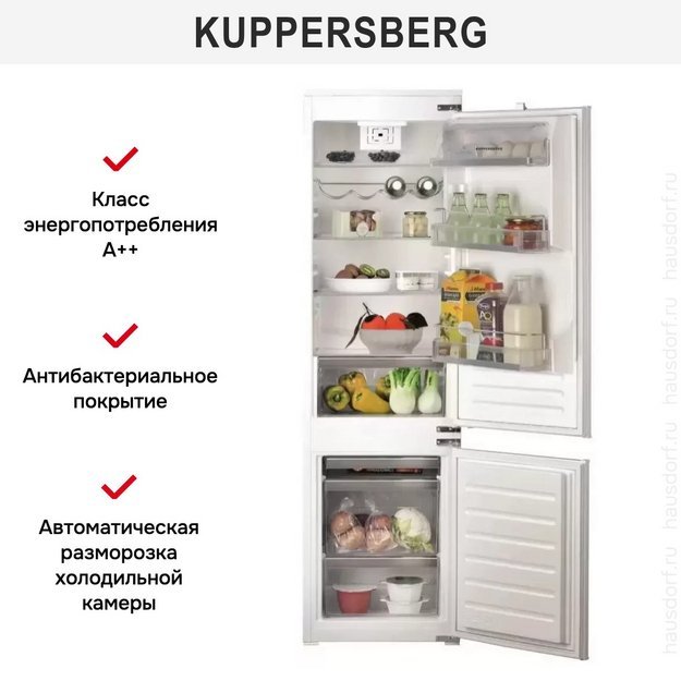 Встраиваемый холодильник Kuppersberg KRB 19369 — компактная и стильная модель, выполненная в белом цвете. Элементы фурнитуры изготовлены в цвете нержавеющей стали и светлого оттенка серого. Отсутствие ручек позволит встроить модель в кухонный гарнитур, в котором используется технология Push-Pull, и максимально визуально разгрузить пространство. Благодаря классическом минималистичному дизайну, данное устройство впишется в любой интерьер, а небольшие габариты делают возможным установку модели даже в самые компактные интерьеры. Высота холодильника — 193 см, также он имеет небольшую ширину и глубину и может быть размещен в малогабаритной кухне.