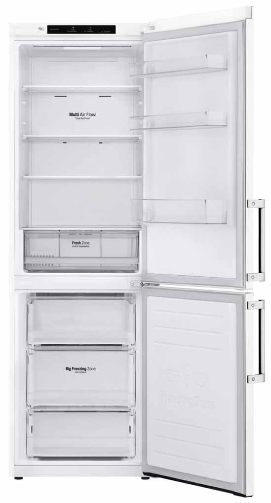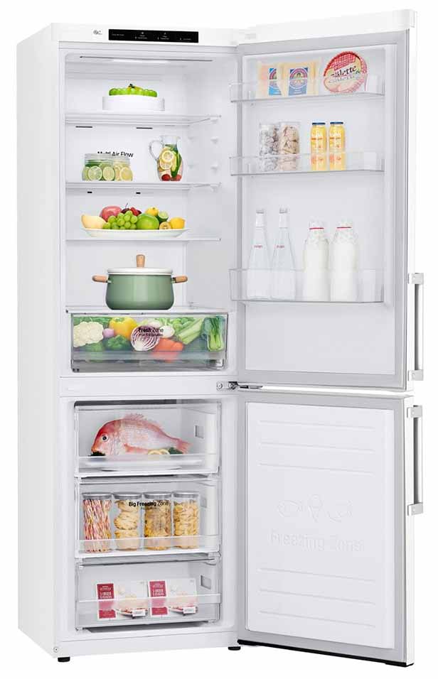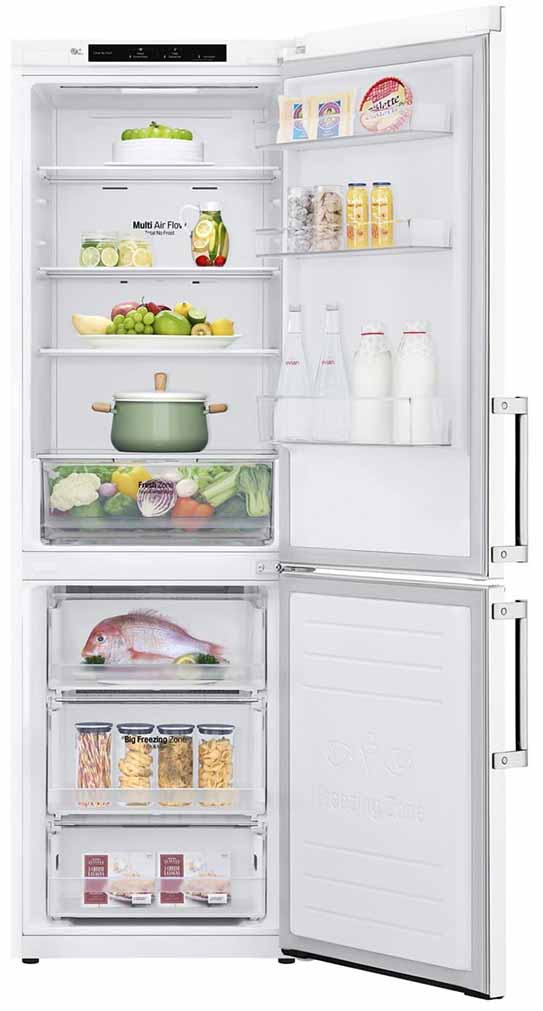 Специальная зона свежести предназначена для правильного и более длительного хранения овощей, фруктов, зелени. В ней поддерживается околонулевая температура, поэтому продукты не перемораживаются и не пересыхают. Система охлаждения этого холодильника — Multi-Airflow-System.