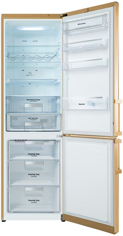 Специальная зона свежести предназначена для правильного и более длительного хранения овощей, фруктов, зелени. В ней поддерживается околонулевая температура, поэтому продукты не перемораживаются и не пересыхают. Система охлаждения этого холодильника — Multi-Airflow-System.