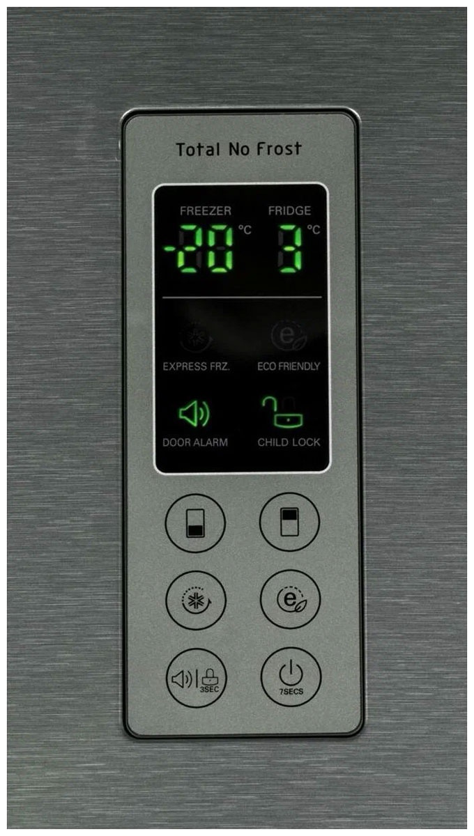 Гораздо точнее сориентироваться по индикаторам можно в холодильниках с электронной системой управления. Эти устройства обычно оснащены дисплеем, на котором высвечиваются значения фактической температуры в холодильной и морозильной камерах. Рядом с ними располагаются кнопки, во многих случаях сенсорные, при помощи которых можно регулировать температуру в каждой камере отдельно, и индикаторы включения этих камер. Здесь же, на панели инструментов, находятся индикаторы, указывающие на активацию дополнительных опций — например, режимов быстрого замораживания и быстрого охлаждения, отпускного режима, блокировки панели управления от детей.