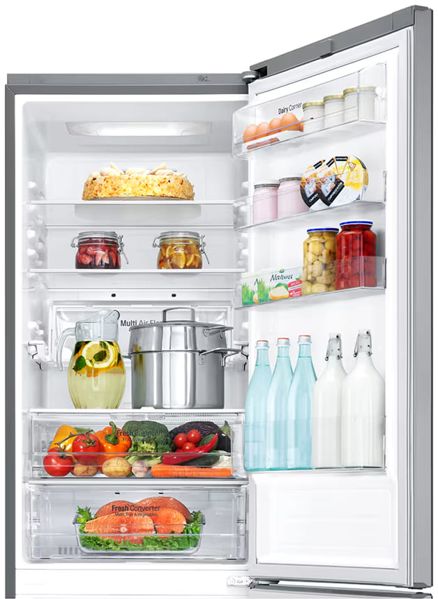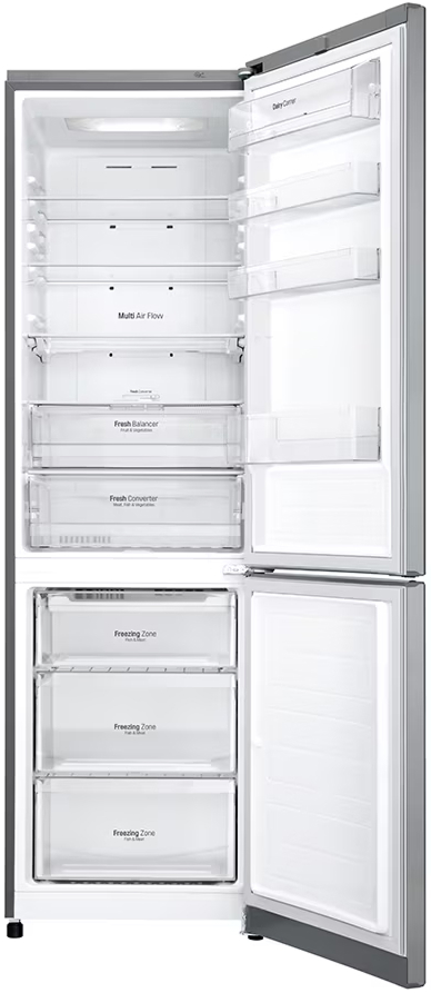 Специальная зона свежести предназначена для правильного и более длительного хранения овощей, фруктов, зелени. В ней поддерживается околонулевая температура, поэтому продукты не перемораживаются и не пересыхают. Система охлаждения этого холодильника — Multi-Airflow-System.