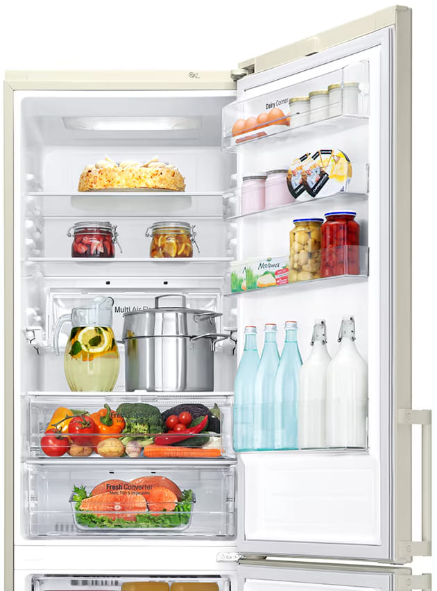 Специальная зона свежести предназначена для правильного и более длительного хранения овощей, фруктов, зелени. В ней поддерживается околонулевая температура, поэтому продукты не перемораживаются и не пересыхают. Система охлаждения этого холодильника — Multi-Airflow-System.