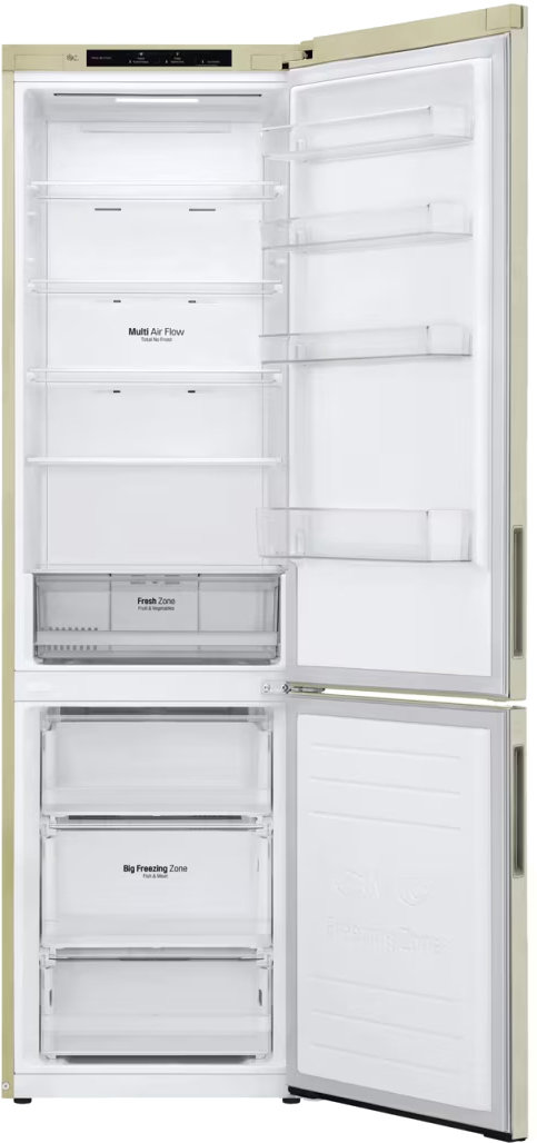 Холодильник LG GA-B509CECL — отдельно стоящий двухкамерный агрегат со стильным металлическим бежевым фасадом. Его габариты 203×59,5×68,2 см делают модель высокой, но не слишком широкой, что упрощает установку в стандартной кухне. Общий полезный объем 365 л обеспечивает достаточно места для запасов, при этом полезный объем холодильного отсека составляет 277 л, а морозильного — 88 л.