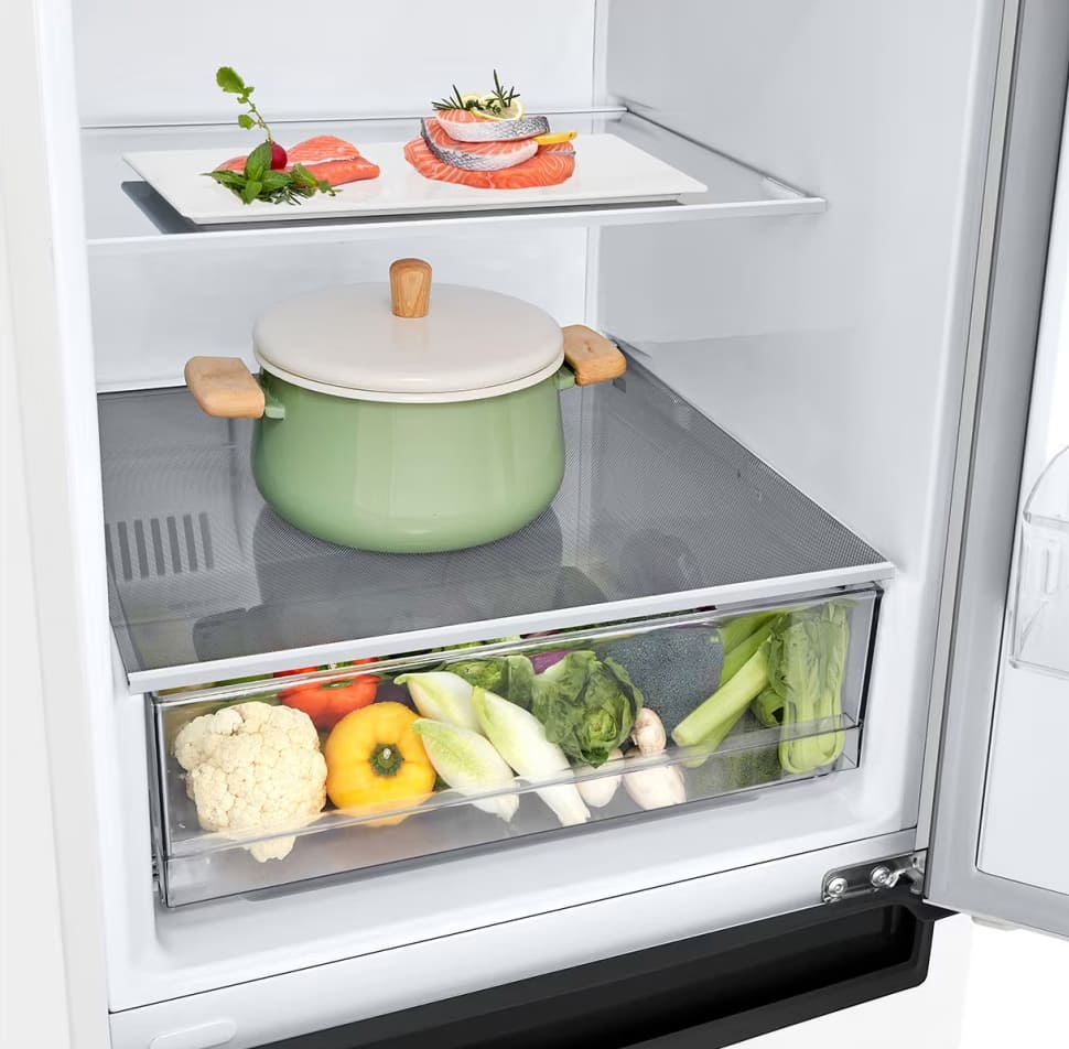 Внутреннее наполнение холодильной и морозильной камер включает многочисленные и разнообразные полки, ящики, контейнеры. Все они используются для более удобного и рационального размещения продуктов, которое обеспечивает хороший обзор содержимого холодильника и быстрый поиск.