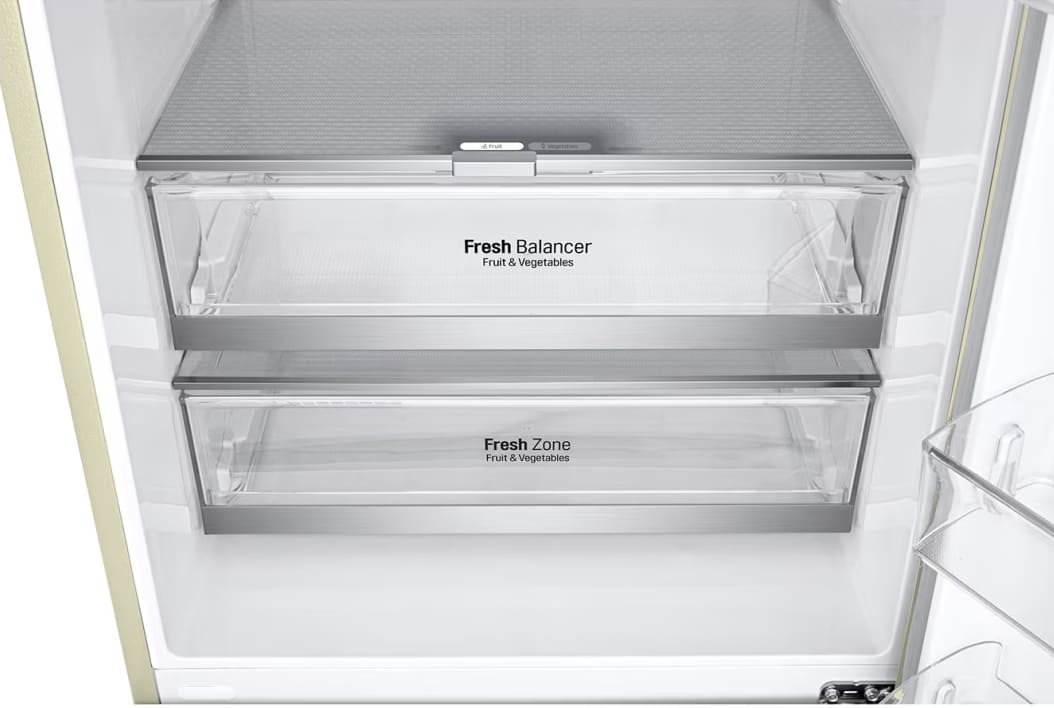 Вместительные контейнеры позволяют хранить достаточное количество овощей и фруктов. Для более длительного хранения и поддержания свежести овощей и фруктов разработаны специальные системы хранения. Среди них, например, зона свежести с увеличенной влажностью до 85% и температурой около 0 градусов. Это герметично закрывающийся ящик, часто на выдвижных роликах или направляющих, в котором имеется специальное задвижка, позволяющая регулировать влажность. Как известно, при более высокой влажности продукты с большим содержанием воды дольше остаются свежими.