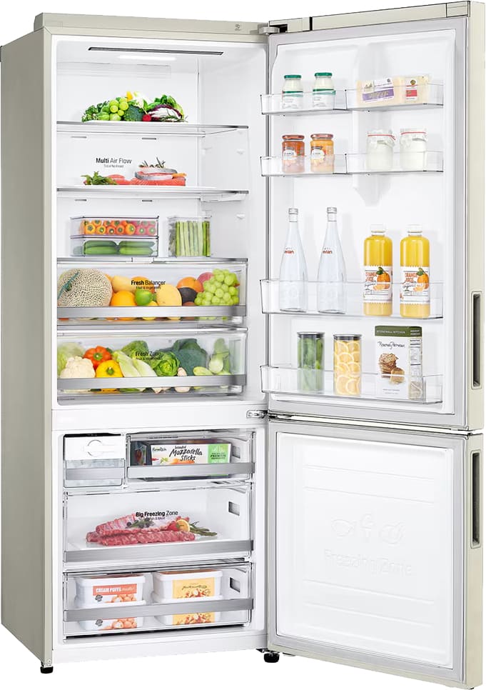 Специальная зона свежести предназначена для правильного и более длительного хранения овощей, фруктов, зелени. В ней поддерживается околонулевая температура, поэтому продукты не перемораживаются и не пересыхают. Система охлаждения этого холодильника — Multi-Airflow-System.