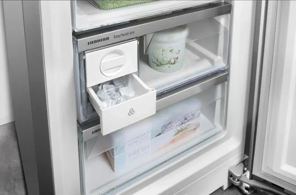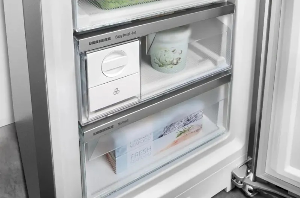 Морозильная камера четырехзвездочная, поддерживает диапазон −15...-26°C. No Frost избавляет от ручной разморозки, три выдвижных ящика с системой FrostSafe и Vario упорядочивают запас. Производительность замораживания до 16 кг/сутки, а при отключении питания холод сохраняется до 24 часов. Ледогенератор EasyTwist дает запас кубиков без подключения водопровода.