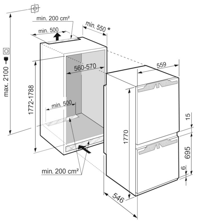 - Габариты ниши для встраивания (ВхШхГ): 177.2-178.8 х 56 - 57 х 55 см