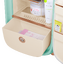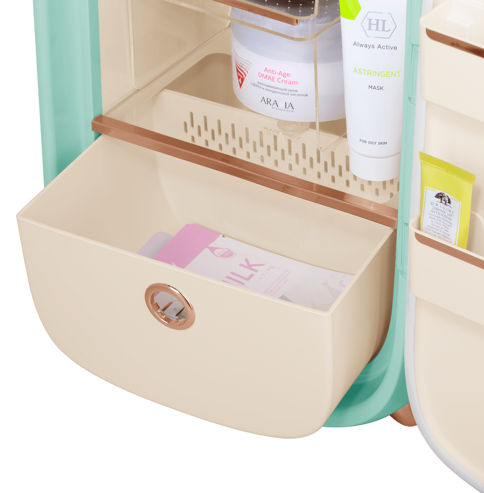 Полезный объём составляет 12,3 литра, что достаточно для хранения кремов, масок и различных упаковок других средств. Две стеклянные полки прочные и простые в уходе, они выдерживают размещение баночек разной величины. На дверце предусмотрено две полки для мягких контейнеров и тюбиков, а вместительный выдвижной ящик позволяет найти место для больших упаковок или наборов. LED-подсветка делает содержимое хорошо видимым и экономит энергию.