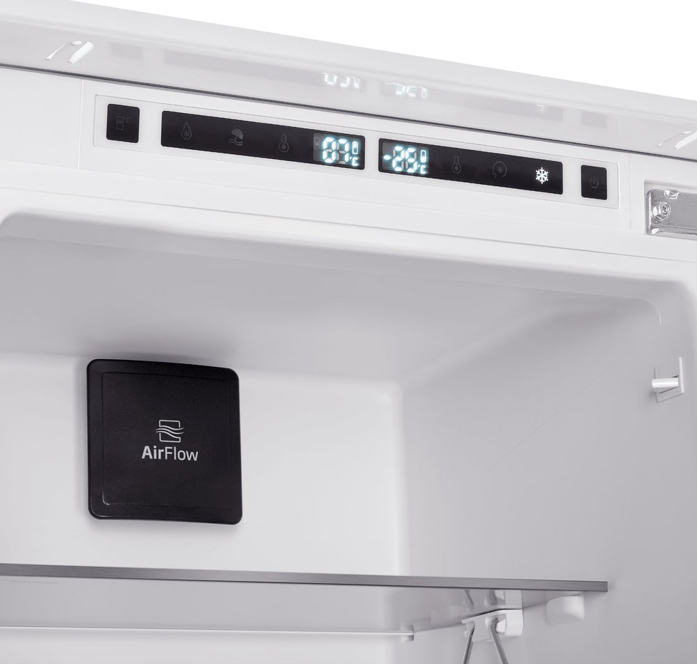 No Frost (Total No Frost, Frost Free): вентилятор обеспечивает циркуляцию охлажденного воздуха, благодаря чему лед не нарастает на стенке, а концентрируется только на скрытом внутри холодильника испарителе. Талая вода собирается в специальной емкости и испаряется. Такой холодильник не нужно размораживать – это экономит время и позволяет не останавливать прибор. Благодаря этим плюсам в современных моделях No Frost – самая распространенная система.