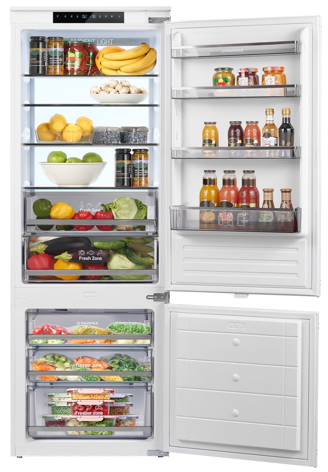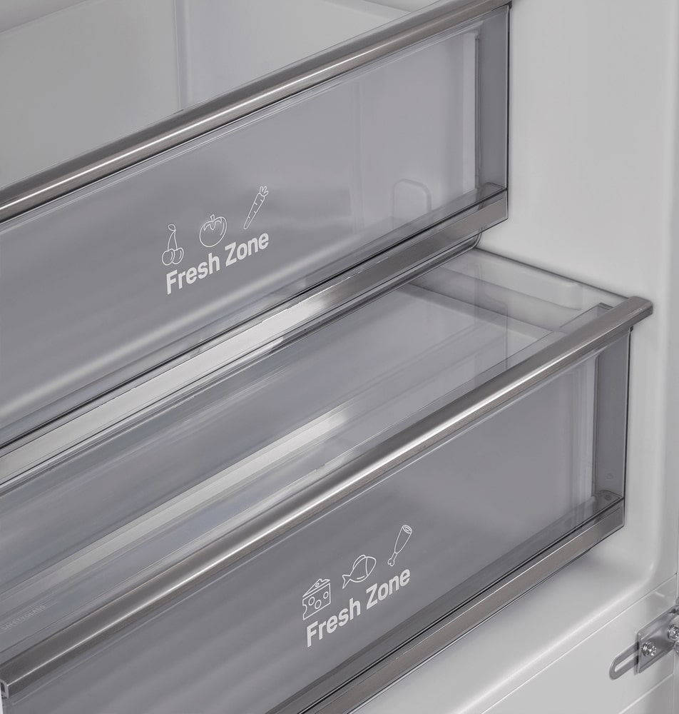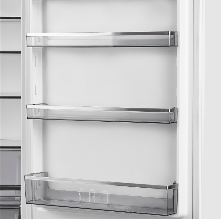 Внутреннее пространство организовано для практичного хранения продуктов повседневного и долгосрочного назначения. В холодильной части имеются четыре полки из закаленного стекла, которые легко выдерживают вес посуды и удобно моются. В морозильной зоне три выдвижных ящика служат для упорядочивания запасов. Функция суперзамораживания помогает быстро подготовить продукты к длительному хранению. Зона свежести, где поддерживается оптимальная влажность, пригодится для овощей, фруктов и деликатных продуктов.