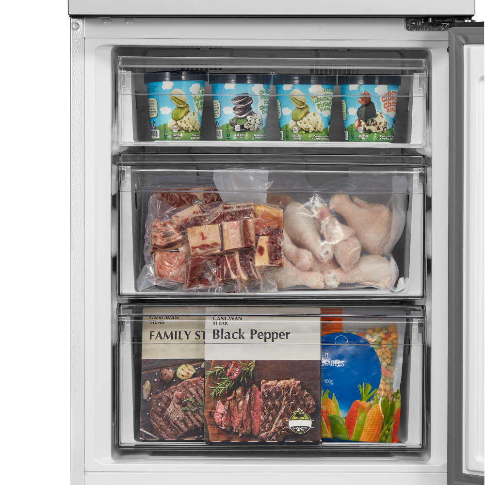 Трехкамерные модели выпускаются в нескольких вариантах. В некоторых случаях в качестве третьей камеры поступает так называемая зона свежести — отделение, где поддерживается температура около 0 градусов. В другом варианте подобные модели имеют морозильную камеру, состоящую из двух выдвижных ящиков.