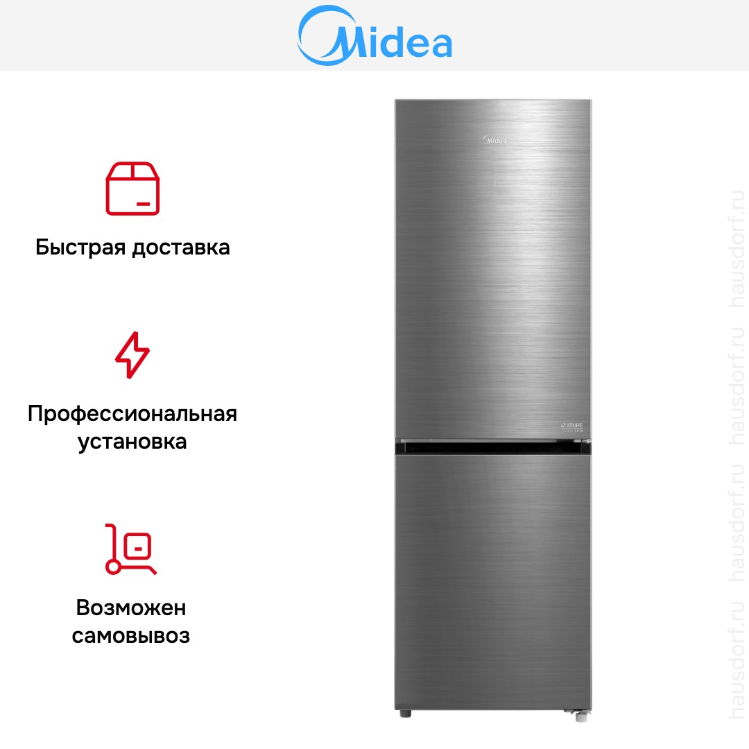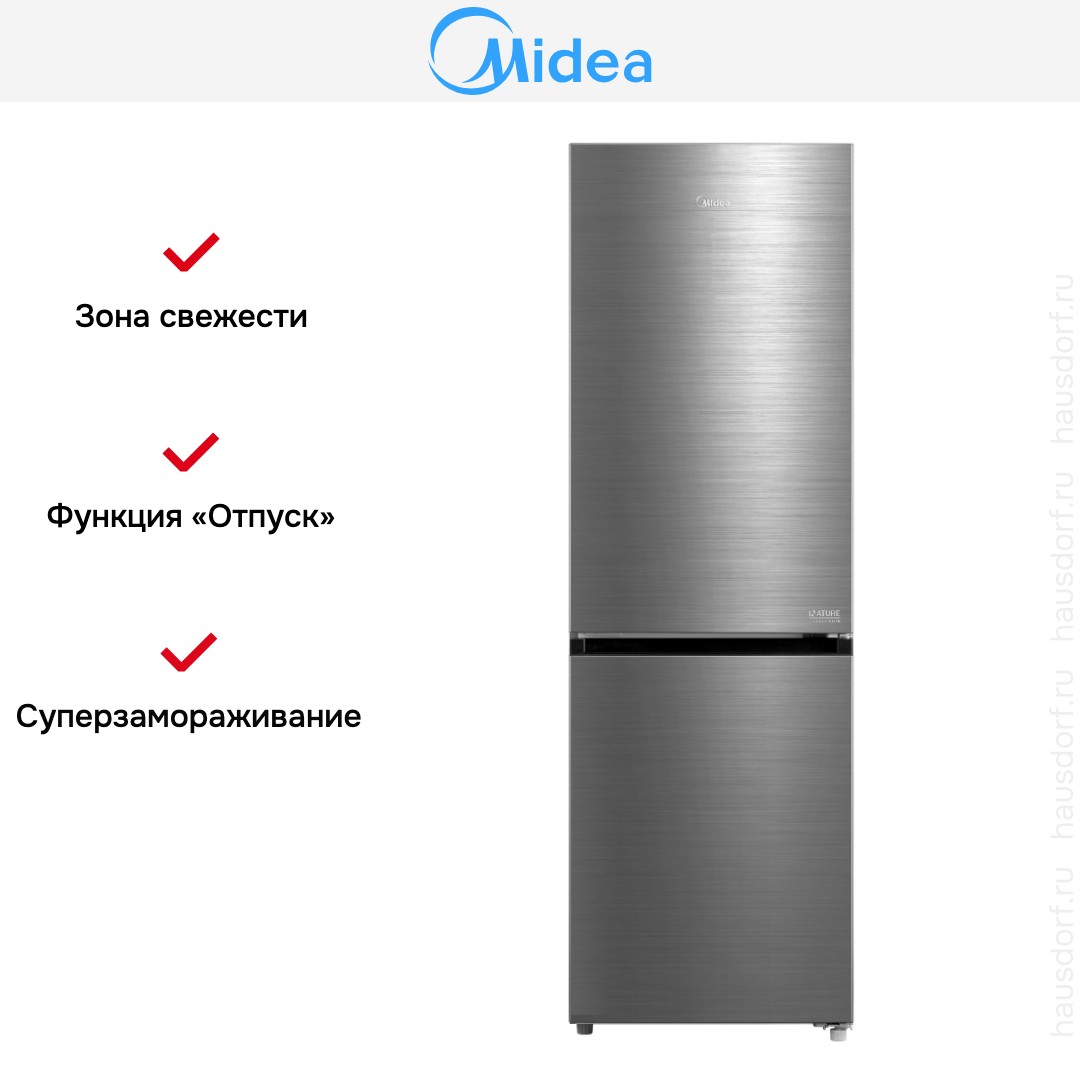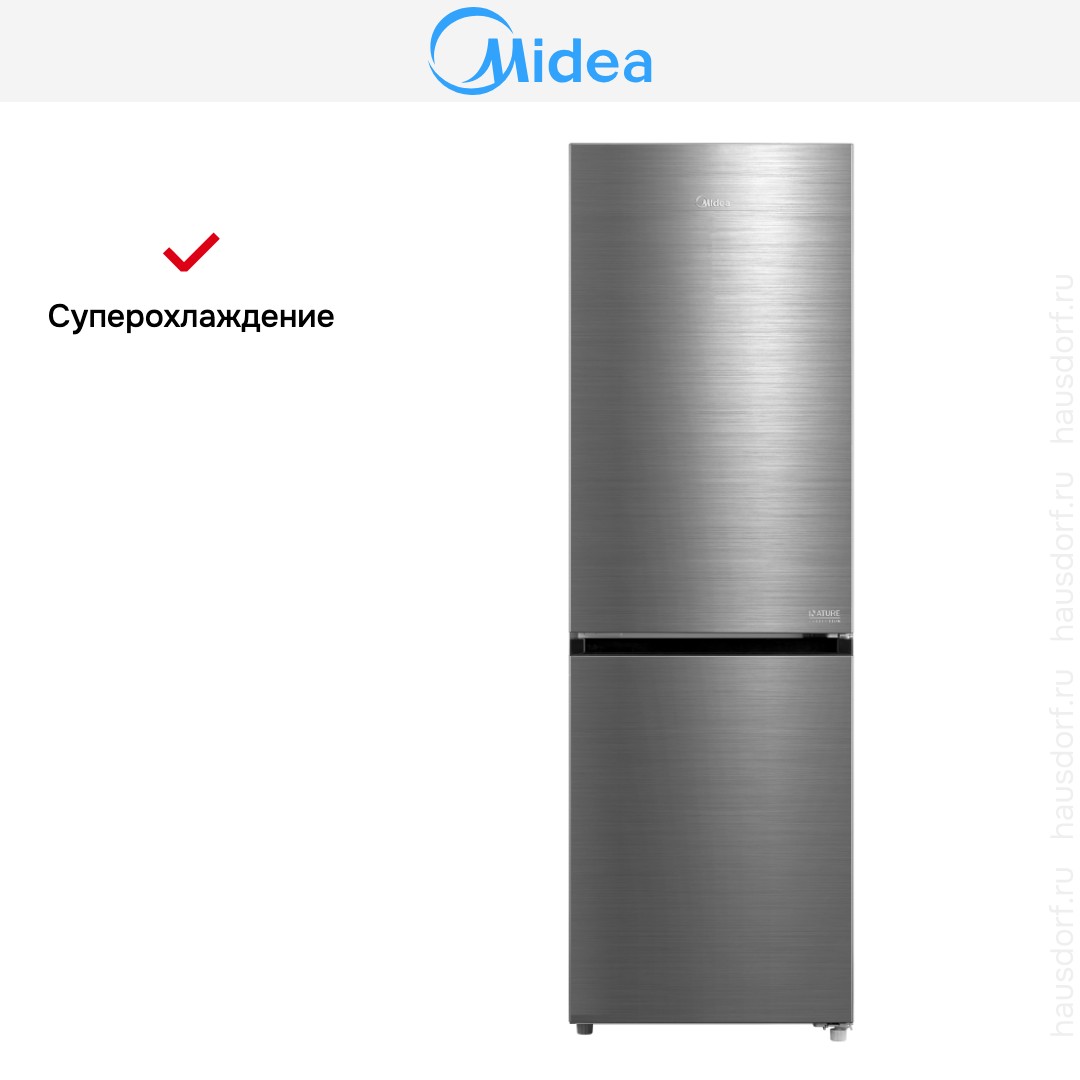 Холодильник Midea MDRB469MGF46I — отдельно стоящий двухкамерный агрегат с морозильной камерой внизу и стильным покрытием из нержавеющей стали, которое придаёт кухне современный характер. Корпус аккуратных габаритов 185×59.5×66 см занимает умеренно мало места и при этом обеспечивает вместительность, достаточную для семьи среднего размера.