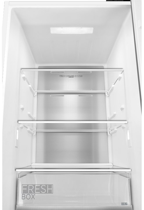 Дверной упор изначально расположен справа, но при необходимости его можно перенастроить на левую сторону, что даёт гибкость при размещении в помещении. Внутреннее пространство продумано до мелочей: регулируемые стеклянные полки, вместительные ящики с системой свежести для овощей и фруктов, а также специализированные отсеки для яиц, молочных изделий и бутылок позволяют адаптировать хранение под индивидуальные потребности.