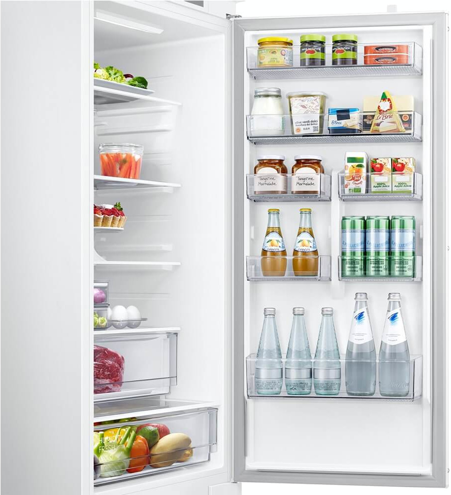 Встраиваемый прибор проще разместить в комнате, даже если общий метраж не такой уж большой. Вы можете спрятать его за декоративной панелью от мебельного фасада — советуем заранее определить нишу и заказывать панели исходя из типа крепления к двери. Способ монтажа в данной модели: скользящее крепление двери (система door sliding) Благодаря внушительным размерам, в частности высоте, она подходит большим пространствам — просторной кухне, еврогостиной. Вы можете поменять направление открывания двери, так как упор переставляемый и ее можно перевесить на другую сторону. Такая функция открывает больше возможностей для установки. Холодильник с морозильником обладает всеми опциями, которые чаще всего ищут и выбирают покупатели. Стандартная конфигурация — универсальный вариант для любой квартиры. Количество камер: 2.