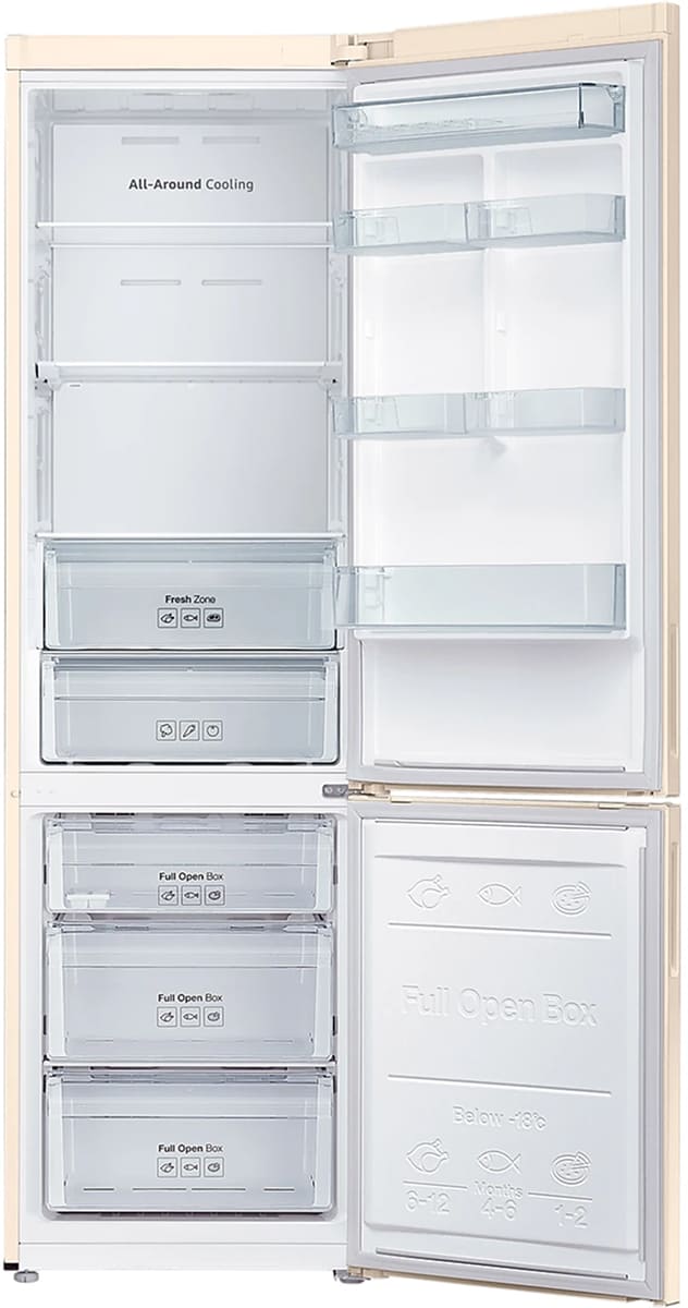 Холодильник Samsung RB37A5200EL сочетает в себе элегантный бежевый корпус из металла и продуманную внутреннюю эргономику, предлагая вместительность 367 литров полезного объема при компактных габаритах 201×59.5×64.7 см, что делает его отличным выбором для просторной кухни и семейного хозяйства: общий объем 387 л распределён между холодильной камерой 269 л и морозильным отделением 118 л, расположенным внизу для удобного доступа. Внешний облик модели подчёркнут строгой линией дверей с правым упором и возможностью перевешивания, аккуратным цифровым дисплеем с сенсорными кнопками и LED-подсветкой внутри, которая обеспечивает равномерное освещение полок из закалённого стекла; на дверце предусмотрено шесть удобных полок, подставка для яиц и зона свежести с двумя контейнерами для овощей и мяса. Технологическая начинка делает эксплуатацию простой и экономичной: инверторный компрессор на базе одного мотора в сочетании с хладагентом R600a обеспечивает стабильное поддержание температур и низкий уровень шума всего 37 дБ, а класс энергоэффективности A+ при годовом расходе 314 кВт·ч гарантирует умеренные счета за электричество. Для сохранения оптимального микроклимата применены двойная система TwinTech и многопоточное циркуляционное охлаждение Multi-flow, которые предотвращают пересыхание продуктов и уменьшают риск смешения запахов между камерами; обе секции оснащены No Frost, что исключает образование льда и минимизирует необходимость ручной разморозки. Морозилка предлагает три вместительных ящика, лоток для льда, функцию суперзамораживания и замораживающую способность до 12 кг в сутки, с рабочим диапазоном температур от −15 до −23 °C, а холодильное отделение имеет три стеклянные полки и возможность тонкой регулировки температуры через цифровое управление, индикаторы показывают текущее состояние выбранного режима, есть режим «Отпуск» для длительного отсутствия без лишних энергозатрат. Практичные размеры упаковки 210.7×65.4×70.2 см облегчают доставку и установку, масса нетто 71 кг при брутто 73 кг — баланс прочности и мобильности при установке на ровную поверхность; напряжение питания 220-240 В и частота 50 Гц соответствуют стандартам бытовой сети. Этот аппарат идеально подойдёт тем, кто ценит строгий дизайн, продуманные отсеки для ежедневных продуктов и надежные технологии сохранения свежести, сочетая стиль, удобство обслуживания и экономичное энергопотребление. Samsung предлагает решение, которое выдержит повседневную нагрузку и станет гармоничным дополнением интерьера.