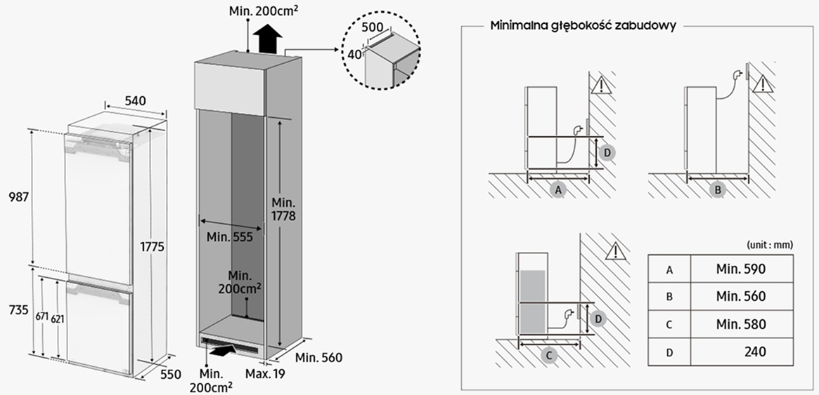 Встраиваемые холодильники монтируются в нишу или колонну. Передняя их часть закрывается декоративным мебельным фасадом и снаружи не отличается от дверцы обычного кухонного шкафа, так что их не нужно подбирать под интерьер помещения. Объем этих холодильников, как правило, несколько меньше, чем у отдельностоящих, так как при встраивании необходимо оставлять свободное пространство для вентиляции. Они отличаются меньшим уровнем шума, а также лучше держат холод и отличаются большей экономичностью из-за дополнительного слоя изоляции. Ассортимент этих холодильников не так велик, как у отдельно стоящих, установка более трудоемкая, а стоимость обычно несколько выше.