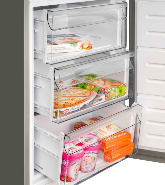 Трехкамерные модели выпускаются в нескольких вариантах. В некоторых случаях в качестве третьей камеры поступает так называемая зона свежести — отделение, где поддерживается температура около 0 градусов. В другом варианте подобные модели имеют морозильную камеру, состоящую из двух выдвижных ящиков.