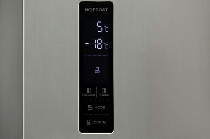 Гораздо точнее сориентироваться по индикаторам можно в холодильниках с электронной системой управления. Эти устройства обычно оснащены дисплеем, на котором высвечиваются значения фактической температуры в холодильной и морозильной камерах. Рядом с ними располагаются кнопки, во многих случаях сенсорные, при помощи которых можно регулировать температуру в каждой камере отдельно, и индикаторы включения этих камер. Здесь же, на панели инструментов, находятся индикаторы, указывающие на активацию дополнительных опций — например, режимов быстрого замораживания и быстрого охлаждения, отпускного режима, блокировки панели управления от детей.