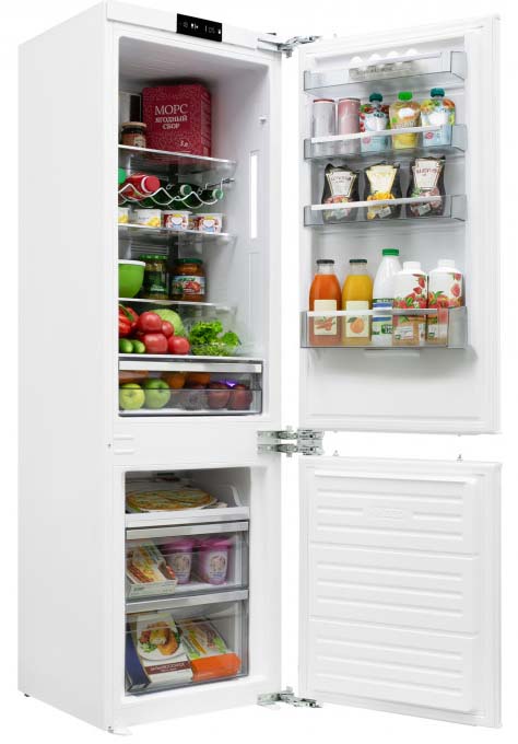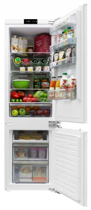Внутреннее наполнение холодильной и морозильной камер включает многочисленные и разнообразные полки, ящики, контейнеры. Все они используются для более удобного и рационального размещения продуктов, которое обеспечивает хороший обзор содержимого холодильника и быстрый поиск.