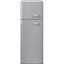 Холодильник с морозильной камерой в стиле 50-х годов серебристого цвета. В разных отделениях разная система размораживания — ручная в верхней, автоматическая в нижней. Двери нельзя перевесить на другую сторону.