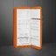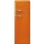 Холодильник с морозильной камерой в стиле 50-х годов оранжевого цвета. Дверь нельзя перевесить на другую сторону. В камерах есть фиксированные и регулируемые полки из закаленного стекла, выдвижные ящики, в том числе отдельная зона свежести. Размораживание двух типов: автоматическое и ручное.