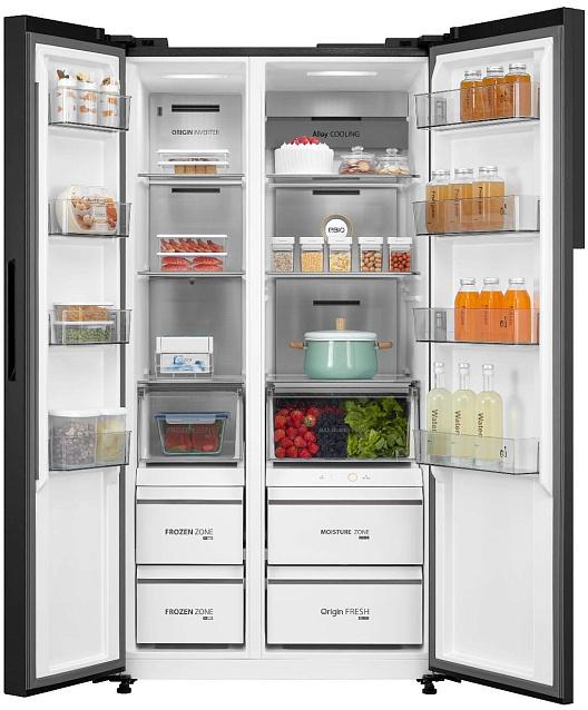 Модель с двумя камерами — холодильной и морозильной — расположенными рядом и отдельным размещением. Общий объем достигает 634 л, полезный — 600 л: холодильная секция располагает около 380 л полезного пространства, морозильная — 220 л. В холодильной части три полки, две из которых можно переставлять, четыре полки на дверце и LED-подсветка для равномерного обзора. Есть зона свежести с тремя контейнерами и системой контроля влажности, что помогает дольше сохранять текстуру и аромат продуктов.