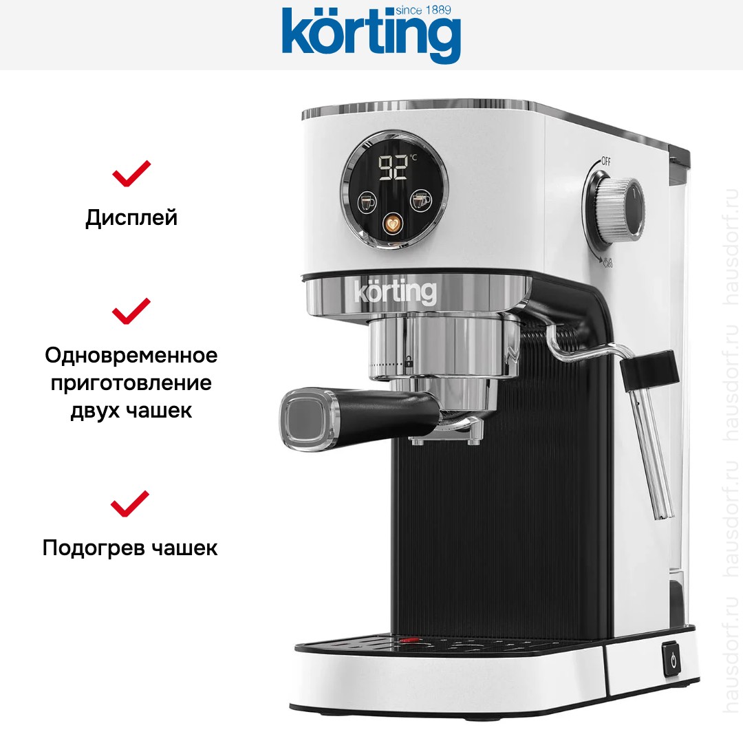 В модели Korting KCM 1003 EW используется молотый кофе: экспериментируйте с сырьем крупного и среднего помола, чтобы добиться идеального вкуса. Данная рожковая кофемашина предназначена в основном для приготовления эспрессо и капучино; благодаря быстрой работе и отсутствию кофейной взвеси в чашке она востребована как в быту, так и в офисах.