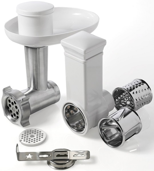 Аксессуары приобретаемые отдельно: 3 насадки для колбасок, насадка для печенья, 3 насадки для нарезки и шинковки, соковыжималка, насадка для листов лазаньи, мясорубка + 4 диска, 5 малых насадок для пасты, насадка для узкой лапши и спагетти, насадка для широкой лапши и спагетти
