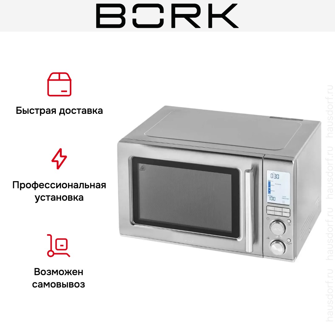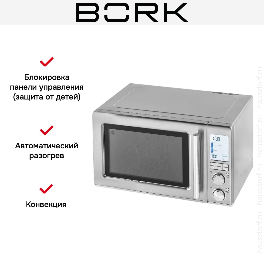 Bork W800 — отдельно стоящая микроволновая печь с камерой объемом 32 литра. Многофункциональная модель оснащена грилем и конвекционным вентилятором, она позволяет готовить в нескольких режимах, в том числе комбинированных. 19 автоматических программ предназначаются для приготовления блюд, размораживания по весу и по времени, разогрева. Имеется функция поддержания тепла готовых блюд. Внутренняя поверхность камеры изготовлена из нержавеющей стали. Сенсор IQ-разогрева и приготовления фиксирует температуру в камере и регулирует процесс приготовления, автоматически подбирая мощность. Функция автоопределения веса позволяет вводить только тип продуктов. Электронная панель управления с кнопками и большим цифровым дисплеем оснащена таймером с автоматическим отключением и подачей звукового сигнала.